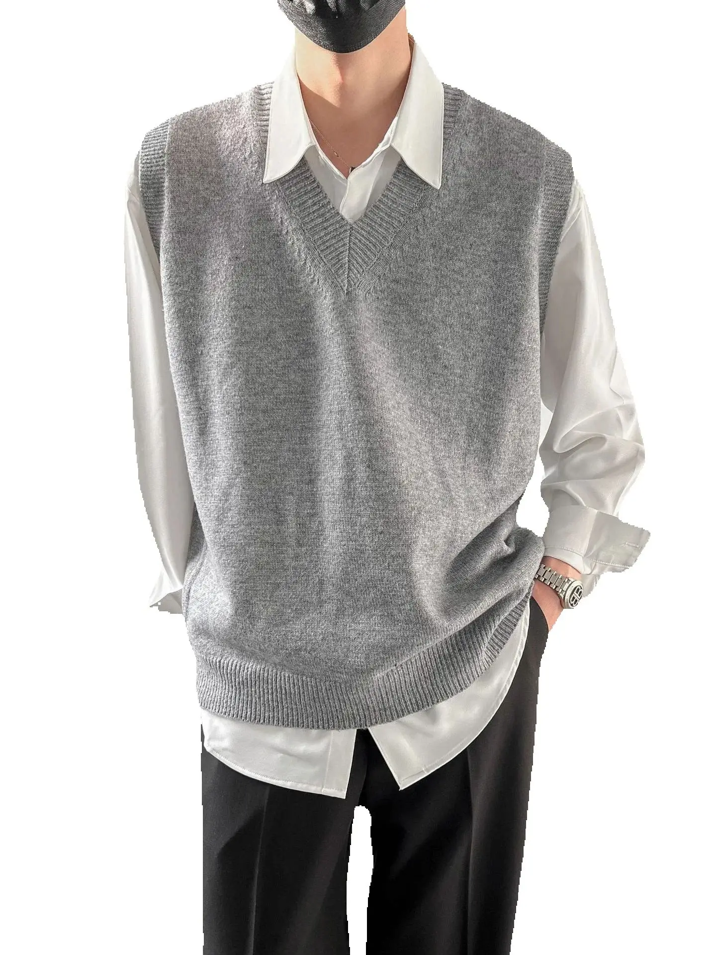TRSYPHXM Herren-Pullover, ärmellos, V-Ausschnitt, Strickpullover, Weste, lockere Basis, koreanischer Stil, Frühling, Herbst, Winter, Innenoberteil