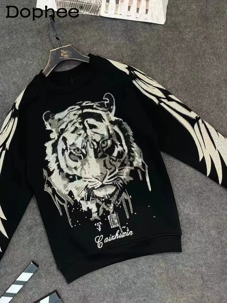 2025 Herbst Winter Neuer Schwarzer Robuster Strass-Herrenpullover Rundhals Locker Lässiges Langarm-T-Shirt