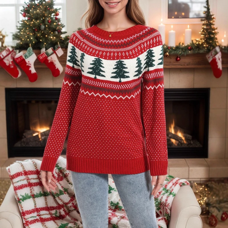 Herbst und Winter neuer Weihnachtspullover für Damen, locker gestrickt, grüne Kiefer, bestickt, vielseitiges Kapuzenoberteil