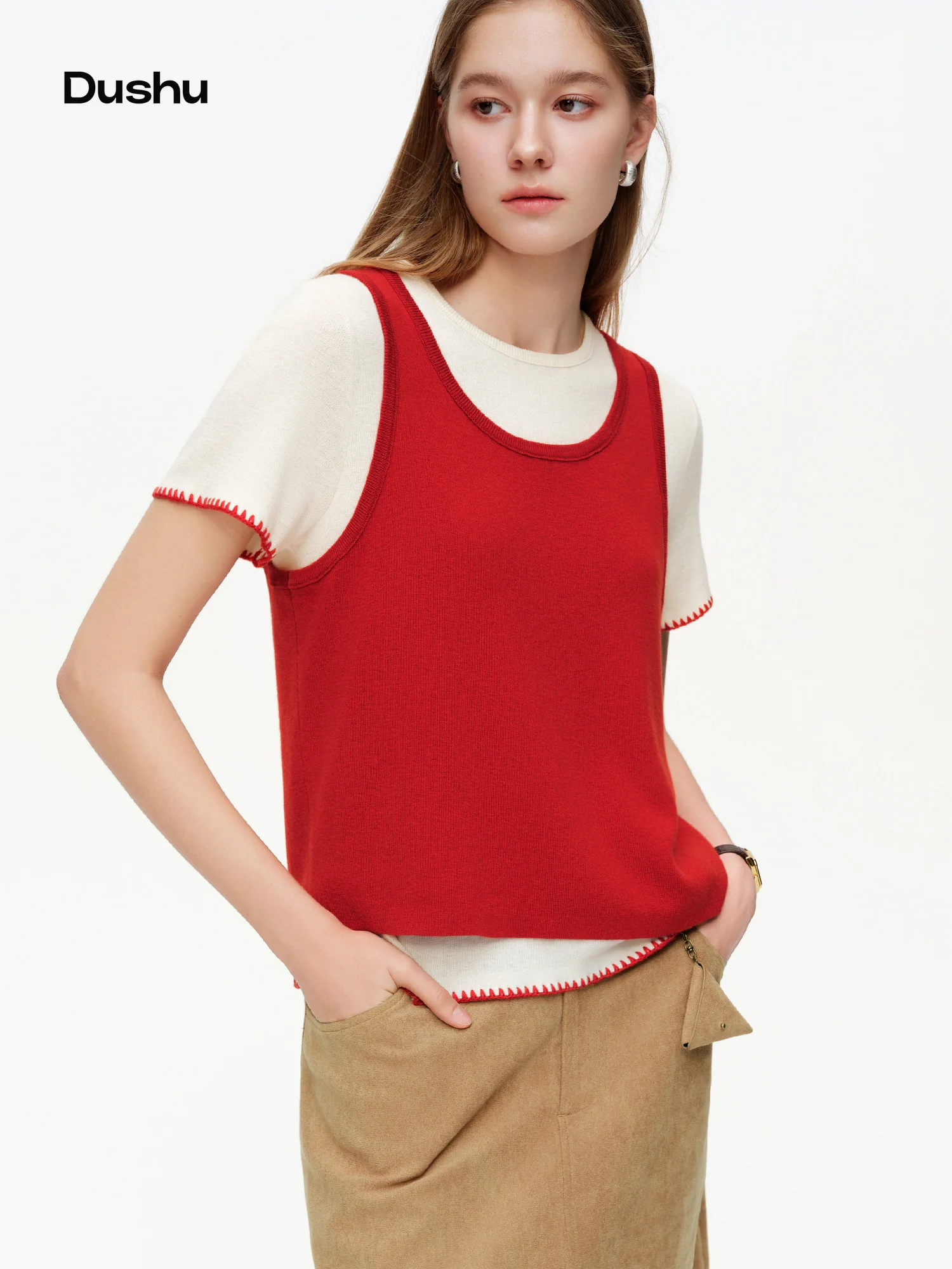 DUSHU Damen Zweiteiliges Farbblock-Strick-Tanktop mit Kurzarm-Set Frühling 2026 Neuheit Modisches Vielseitiges Oberteil-Outfit