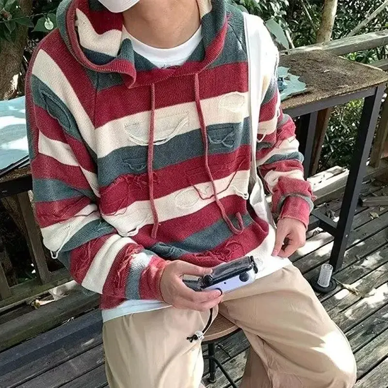 Mode Loch Mit Kapuze Gestrickte Pullover männer Kleidung Kontrast Farben Herbst Winter Amerikanischen Vintage Gestreiften Lose Pullover