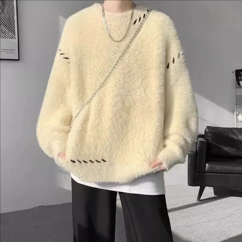 Vintage einfarbige Strickpullover 2025, Herbst-Winter, lockere Mode, ausgefranste Quaste, Herrenbekleidung, Basic, lässig, O-Ausschnitt-Pullover