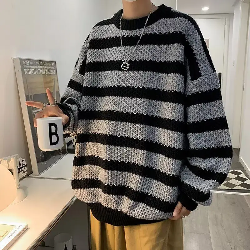Kontrastfarben Gestreifte Strickpullover Herrenbekleidung Rundhalsausschnitt Herbst Winter Junger Stil Lose lässige gespleißte Pullover