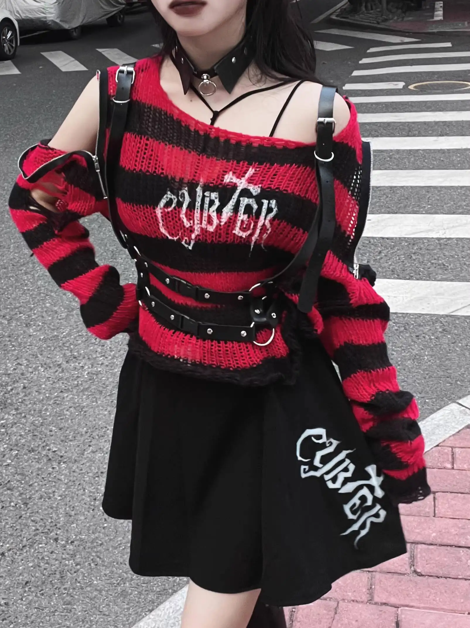 Dunkel gestreifter schulterfreier Pullover für Damen, 2026, Frühling, Punk-Stil, Subkultur, Spice Girl, Y2K, Schwarz, Rot, Distressed-Strickoberteil