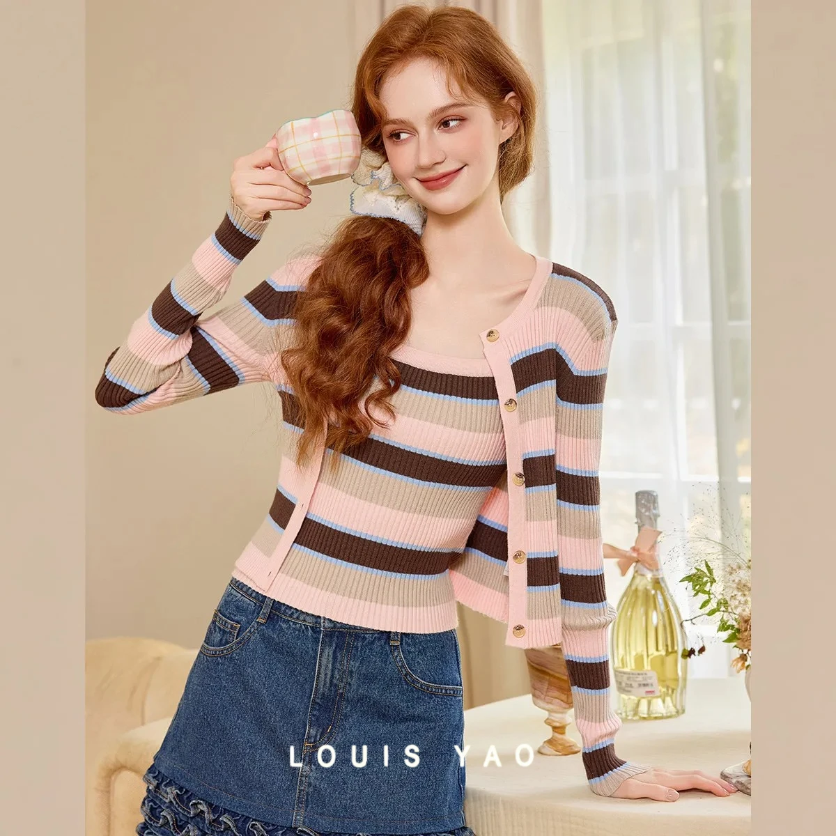 LOUIS YAO Camisole Lässige, vielseitige Damen-Sets 2025, Herbstmode, Strickjacke, Oberteil und gestrickt, gestreift, schmal geschnitten, gestrickt, zweiteiliges Set