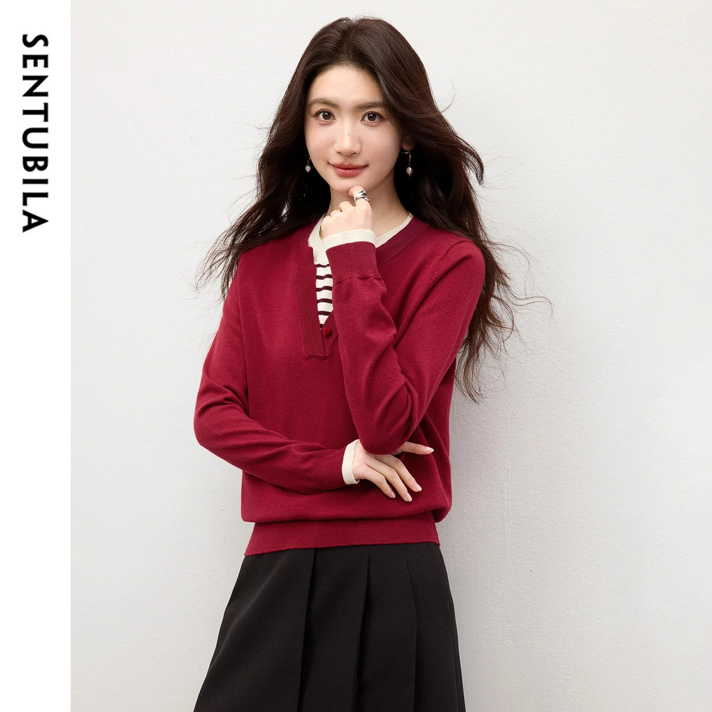 SENTUBILA Damen Strickpullover 2026 Doppellagiger V-Ausschnitt mit Streifenmuster Wollmischung Pullover Frühling Casual Damen Oberteil W61EC5976