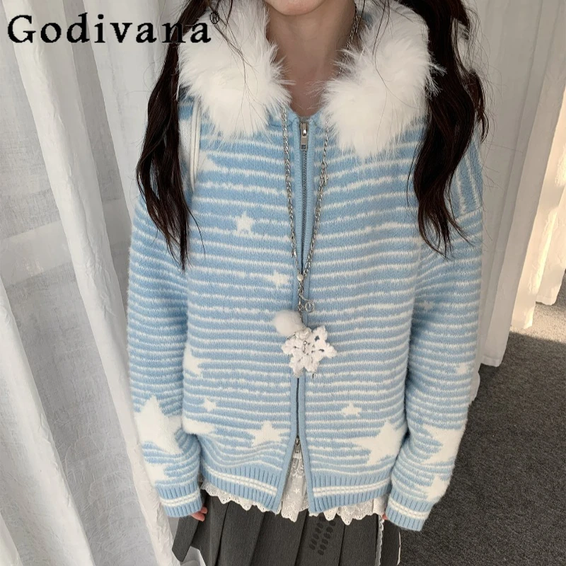 Herbst Winter Gestreifte Strickjacke für Frauen Große Pelz Kragen Mit Kapuze Pullover Mantel Weiblichen Japanischen Stil Süße Gestrickte Mantel