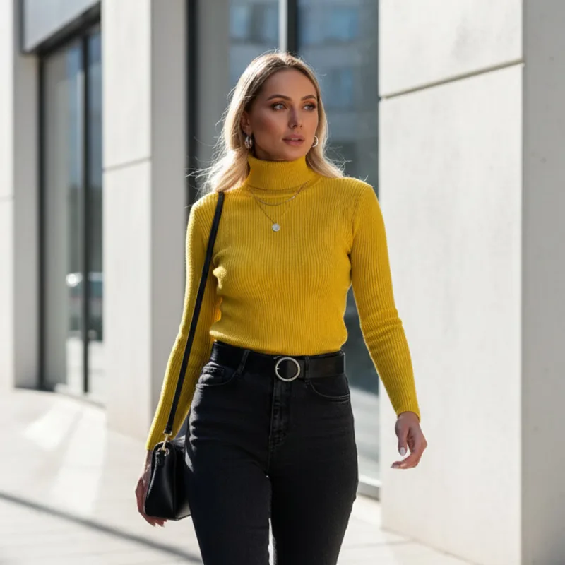Vielseitiger, gerippter, gestrickter Rollkragenpullover für Damen im Herbst und Winter, warmes, bequemes Slim-Fit-Top für lässige Straßen- und Alltagskleidung