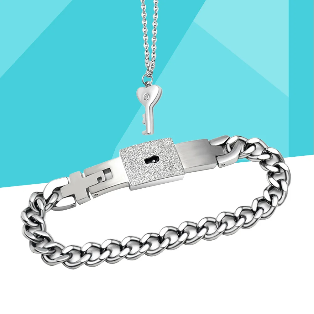 2-teiliges Paar-Gravur-Armband-Halsketten-Set mit ineinandergreifenden Schlossdesigns für Ihn und Sie, Silberlegierung, Schmuckgeschenk, korrosionsbeständig