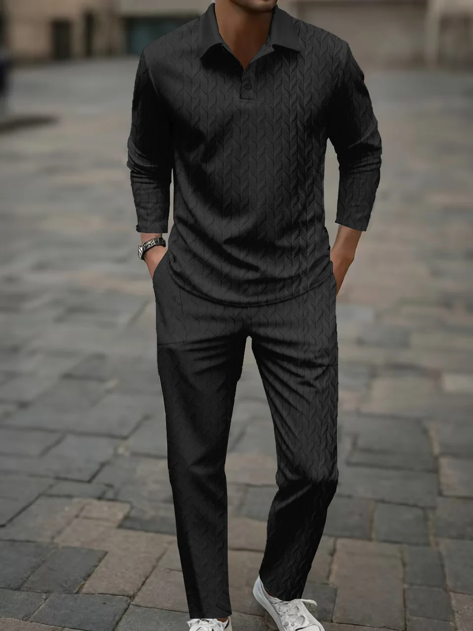 Herren-Mode-Set: Langärmliges Polohemd mit Kragen und Hose – Frühling/Herbst, neuer Stil, lässige Sportbekleidung mit Weizenmuster