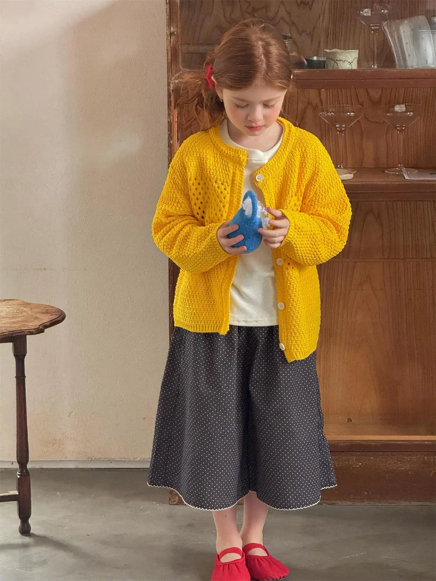 Kinderkleidung Lässiger Strickmantel Frühling 2026 Neuer Stil Mädchen-Pullover Gelber Rundhals-Langarm-Strickcardigan