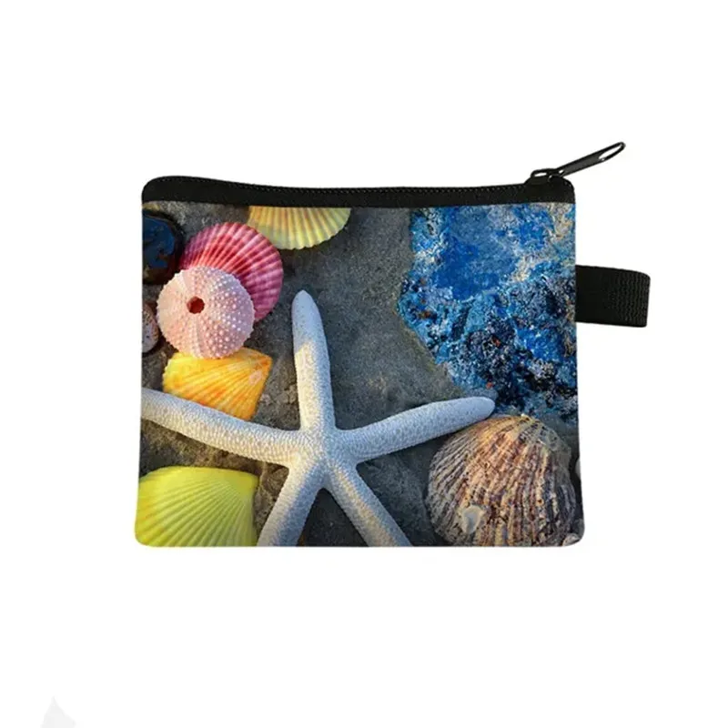 Damen Freizeit-Einkaufstasche mit Seestern- und Muschel-3D-Druck, Geldbörse für Ausweis und Kreditkarten, Mädchen-Münztasche, Ozean-Strand-Münzgeldbörse