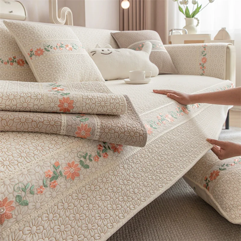 Gesteppter Sofabezug aus gesteppter Retro-Baumwolle im französischen Stil, rutschfester Couchmatten-Schutz, Schonbezug für die ganze Saison, abnehmbares Kissen, Heimdekoration
