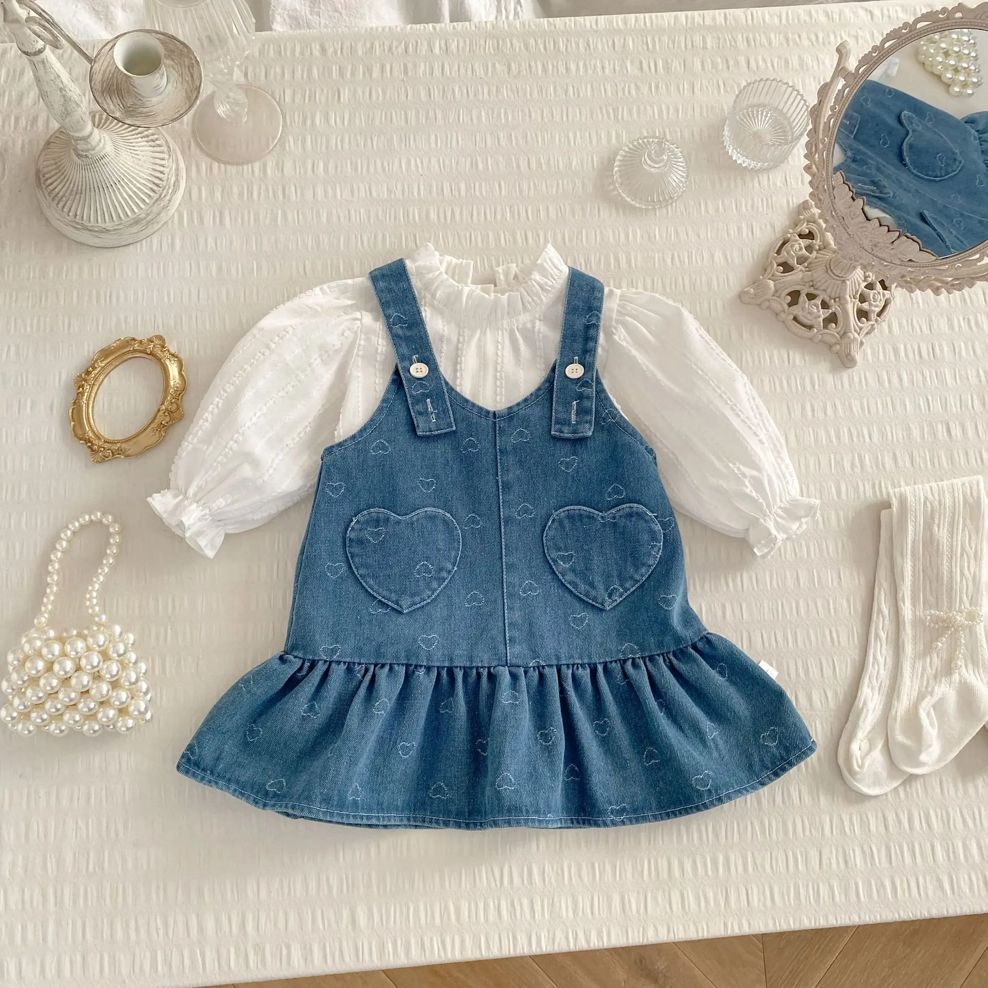 2026 Frühling Neues Ärmelloses Jeanskleid für Babymädchen Baumwolle Kleinkind Mädchenkleid Süßes Trägerkleid mit Herzmuster Kinderkleidung