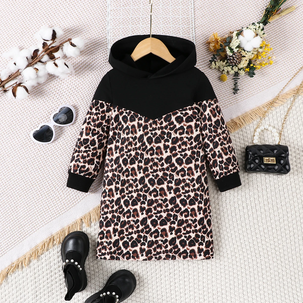 Modisches, lässiges Mädchen-Sweatshirtkleid mit Leopardenmuster und Farbblock-Kapuze und langen Ärmeln für Herbst und Winter