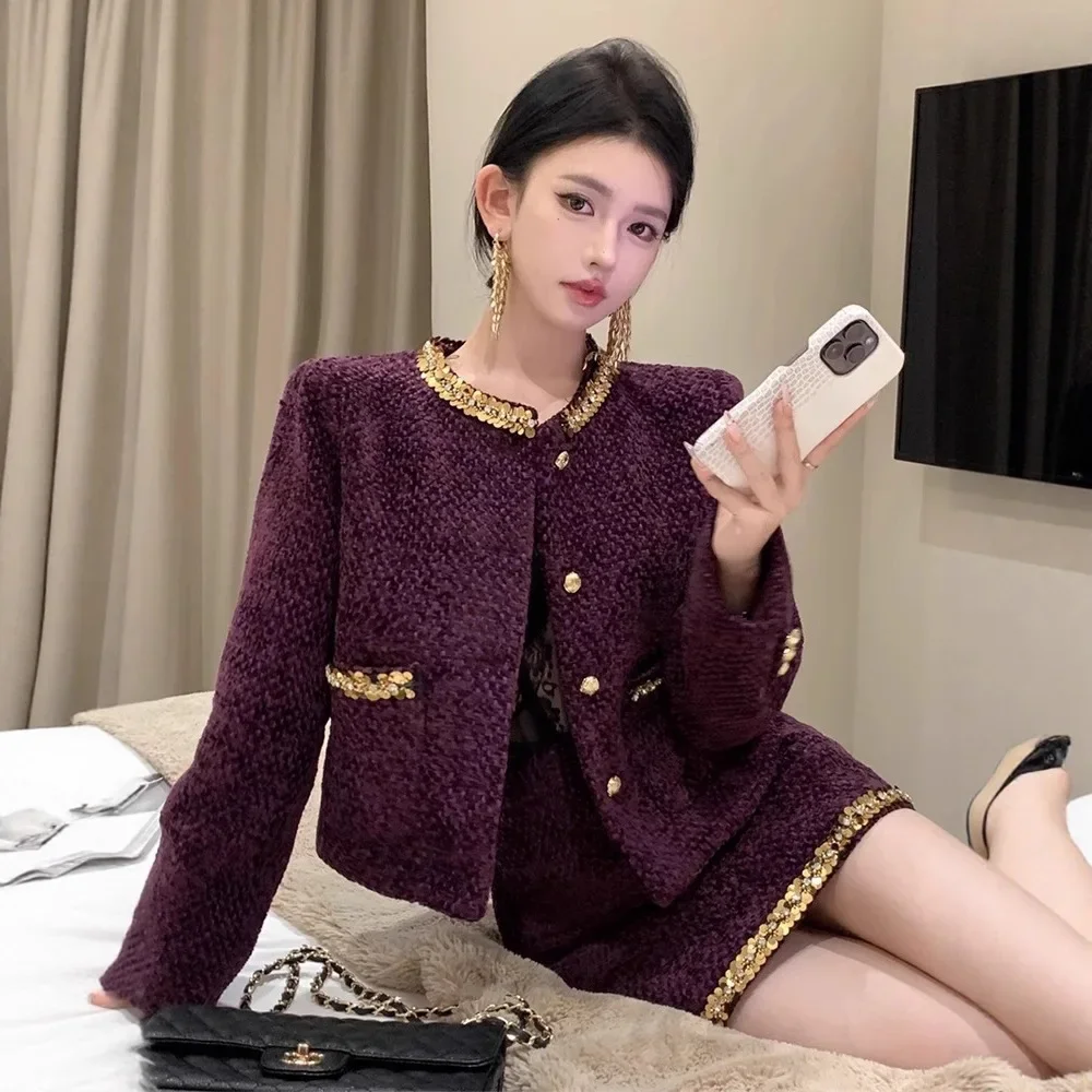 Glänzendes Pailletten-Wollanzug-Set im französischen Stil, Herbst-Winter-Damenmode, brandneu, 2025, schwarze Farbe, gesteppter Minirock und Jacke