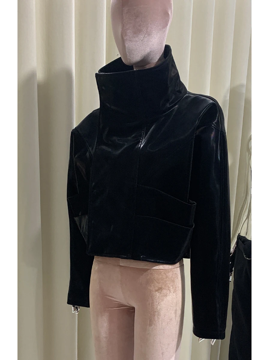Herbst coole hübsche übergroße wasserdichte winddichte gesteppte warme kurze glänzende reflektierende schwarze Pu-Lederjacke Damenbekleidung