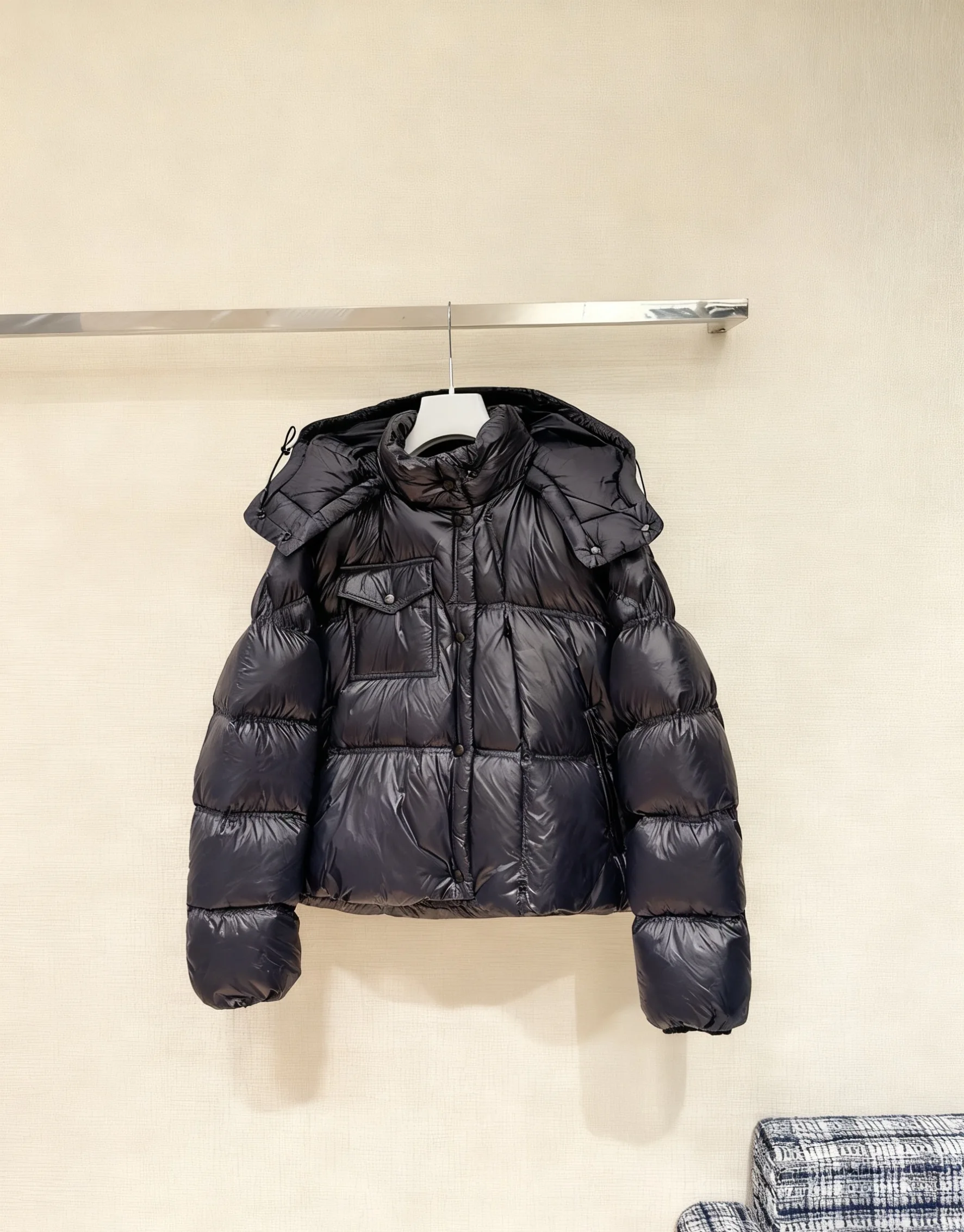 2025, neue glänzende schwarze Pufferjacke für Damen, kurzer Daunenmantel mit Kapuze, warm, gesteppt, Knopftasche, geschwollene Oberbekleidung