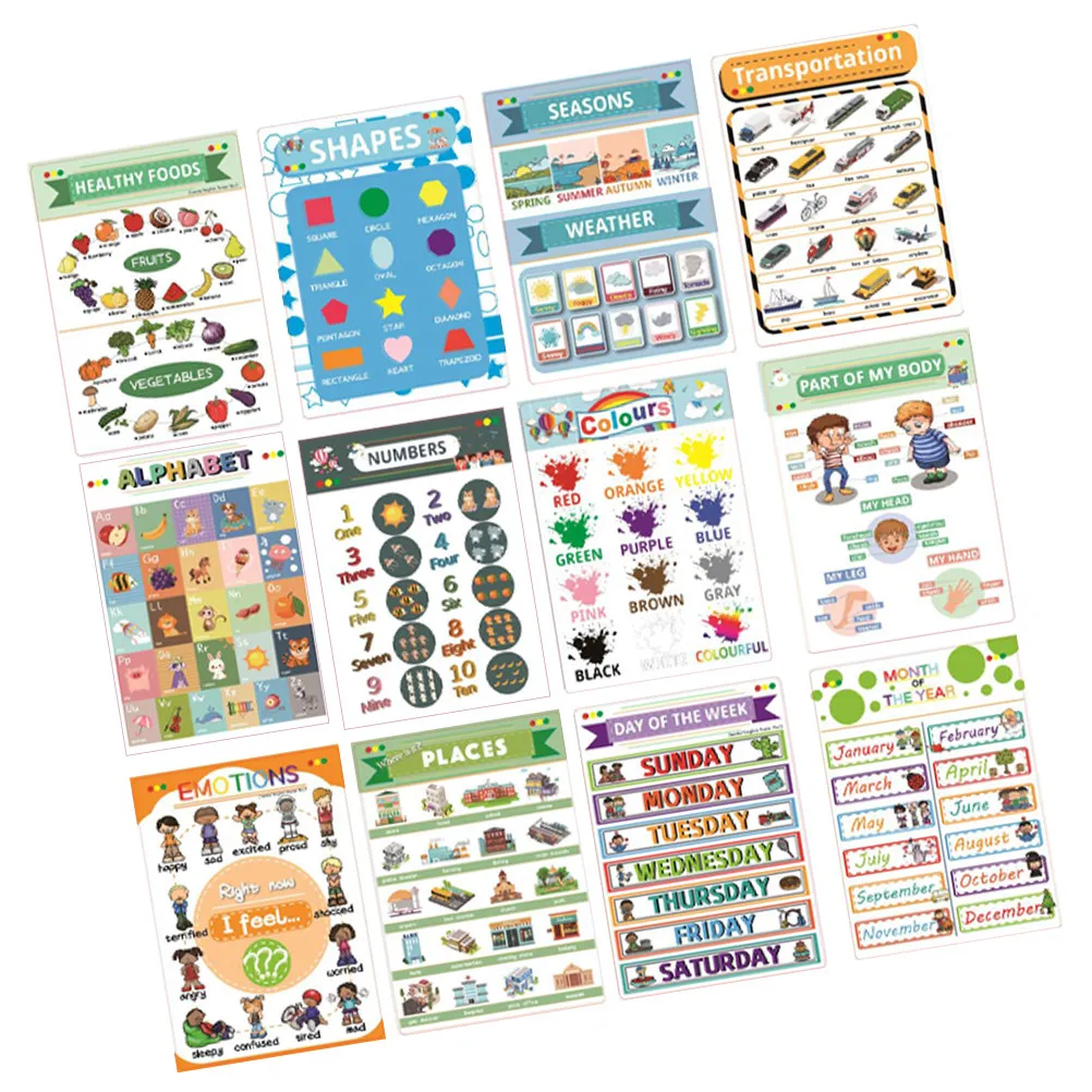 12 Sheets English Preschool Posters Wear-Resistant Kids Learning Wall Charts Cognitive Shapes Teaching Aids for Children Home