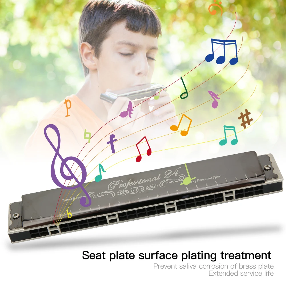 Beginner Gifts Harmonica Professional Mouthorgan Beginner Gifts 1.2mm Brass Base Plate 24‑ Hole Polyphonic Harmonica