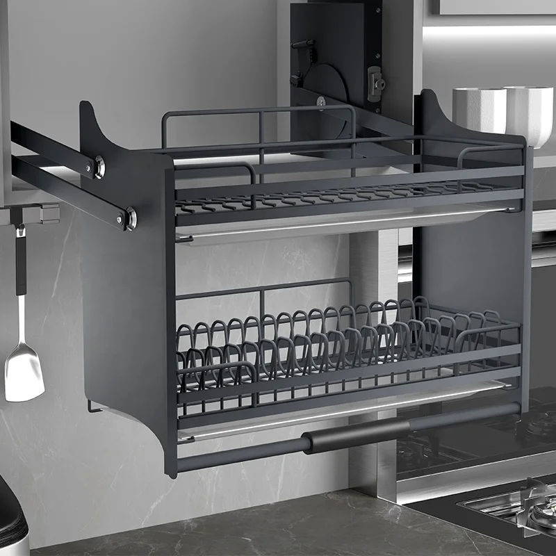 Kitchen Cabinet Storage and Storage Elevator Drop-down Basket with Dish Rack