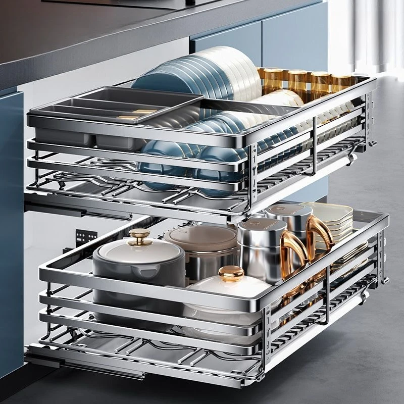 Deep 304 Stainless Steel Kitchen Drawer Double Damping Seasoning Basket Cabinet Built-in Storage Dish Rack Blue