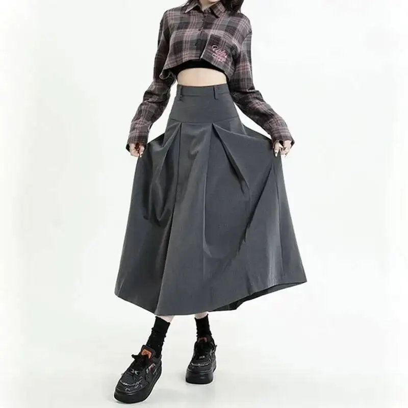 Lucyever College Women Pleated Spring Summer High Waist Long Skirts Woman Korean Style Gray A Line Midi Skirt