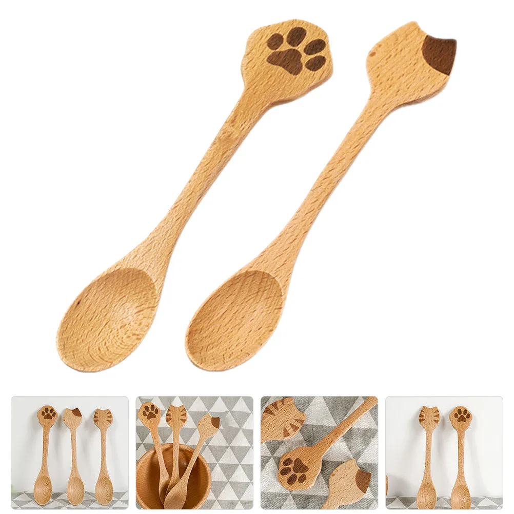 2Pcs Wood Cat Spoon Multifunctional Polished Wooden Utensils for Kitchen Dessert Soup Salad Serving Eating Wood Spoon