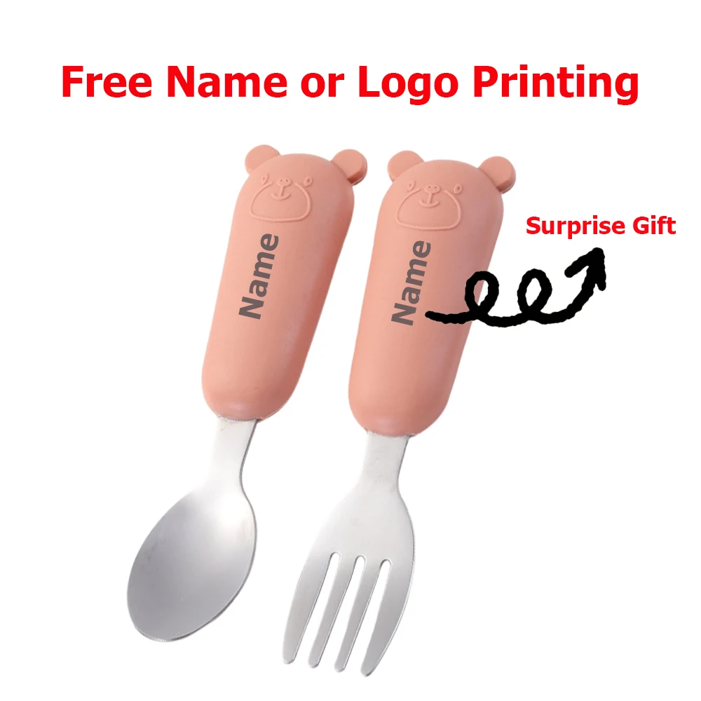 Baby Cutlery Set - Fork & Spoon Stainless Steel with Silicone Handles Free Name Engraving Children's Surprise Gift