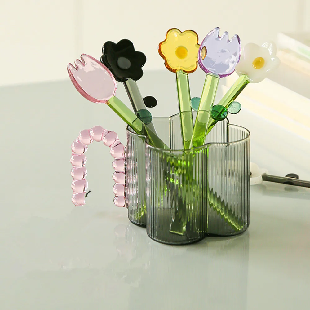 6Pcs/Set Glass Spoons High borosilicate Flower Sunflower Tulip Colorful Tea Coffee Spoons Long Handle Mixed Spoon