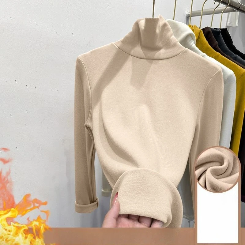 Winter Women's High Neck Top with Thick Velvet Base Spring and Autumn Long Sleeved T-shirt Casual Slim Fit High Neck Warm Jacket