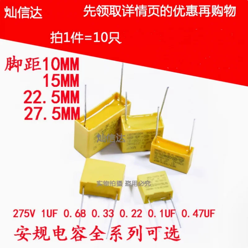 10pcs X2 Safety capacitor 275V 275VAC 10mm 15mm 22.5mm 27.5mm 0.022UF 0.047UF 0.1UF 0.22UF 0.47UF 0.68UF 1UF Polypropylene film