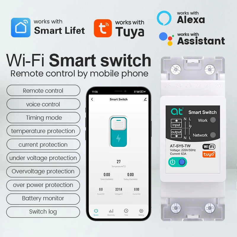 TUYA WIFI Smart Circuit Breaker energy meter 2P 63A DIN Rail for Smart Home wireless Remote Control Smart Switch by APP ATELE