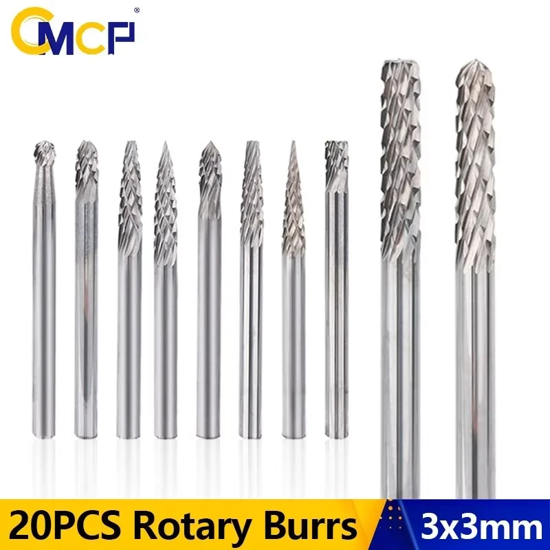 CMCP 20pcs Carbide Rotary Burrs 3mm Shank Rotary File Set Singe Double Cut Carving Grinding Bit for Wood Metal Polishing Tool