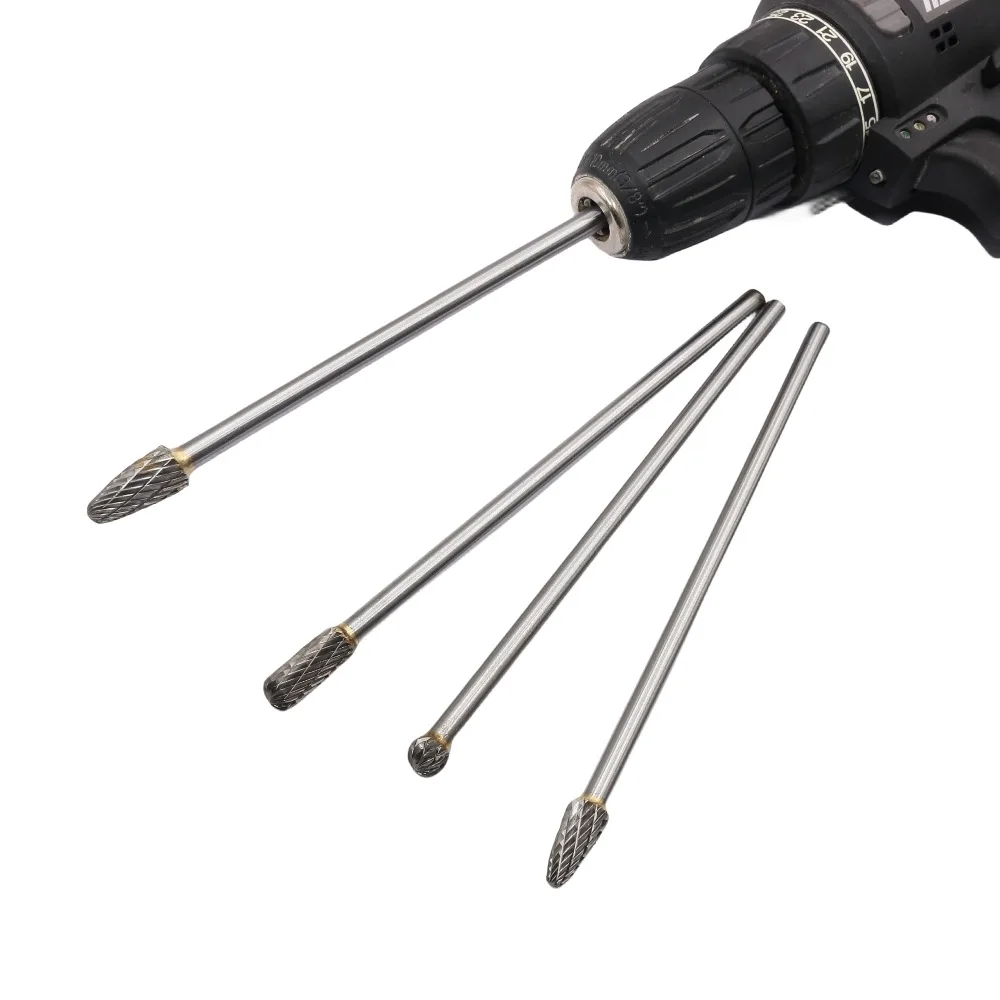 4pc/set 6*8mm/10mm Carbide Rotary Burr Set Rotary File with 1/4" 6mm Diameter Shank 150mm Long Shank for Die Grinder Drill Bit