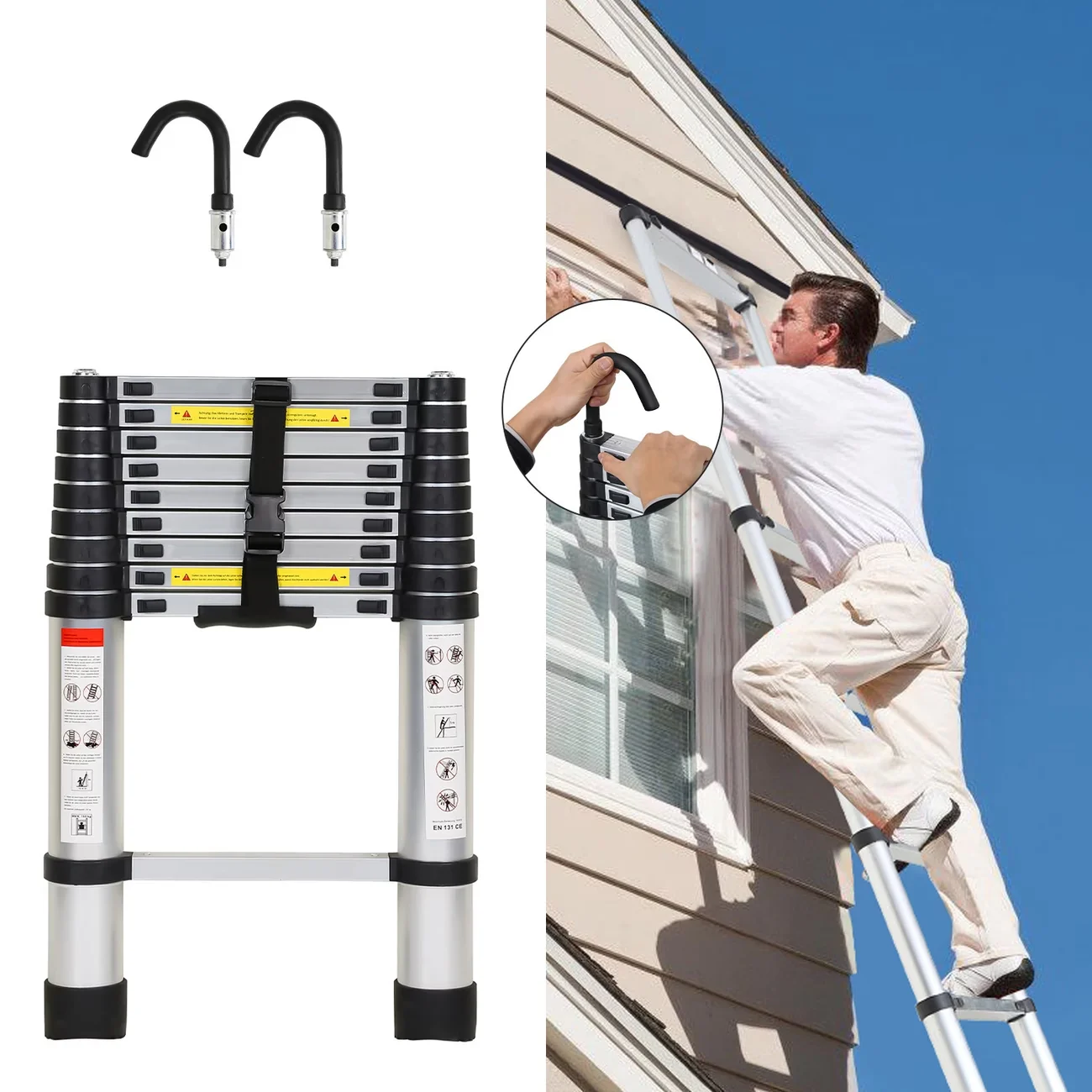 Telescopic Ladder 2.6M-6.3M Extension Ladder Stainless Steel Portable EN131 Standard With Detachable Hooks 150kg Load Capacity