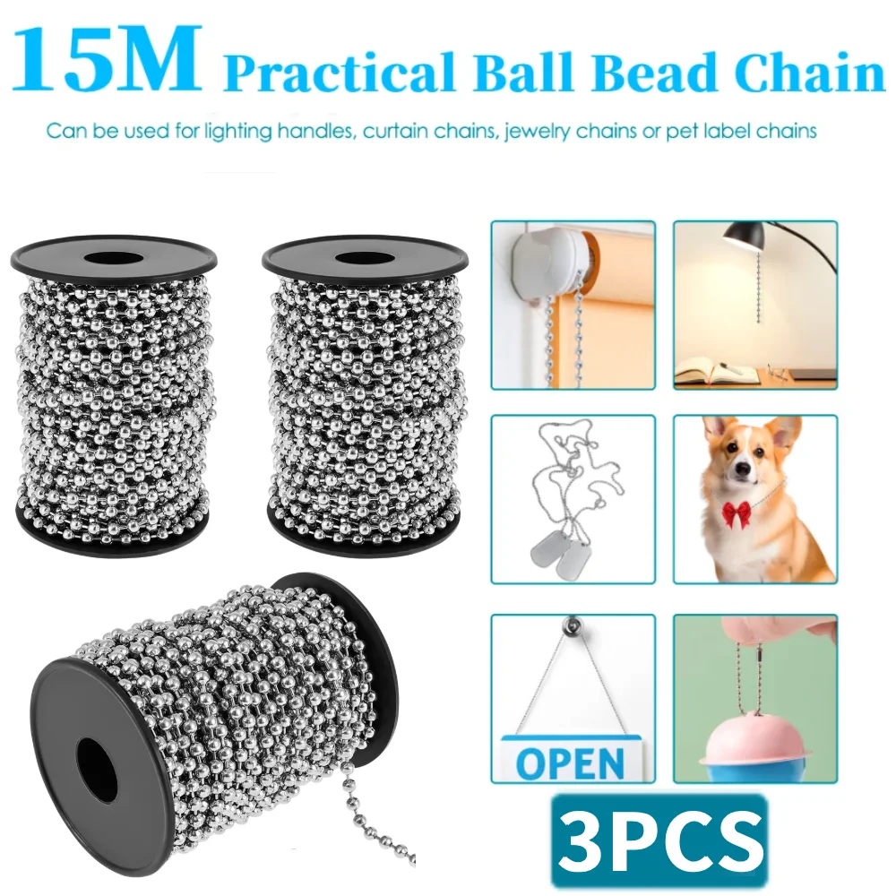 3 Rolls 15Meter Ball Bead Chain Stainless Steel Multipurpose Dog Tag Chain with Spool for Curtain Jewelry Craft Indoor & Outdoor