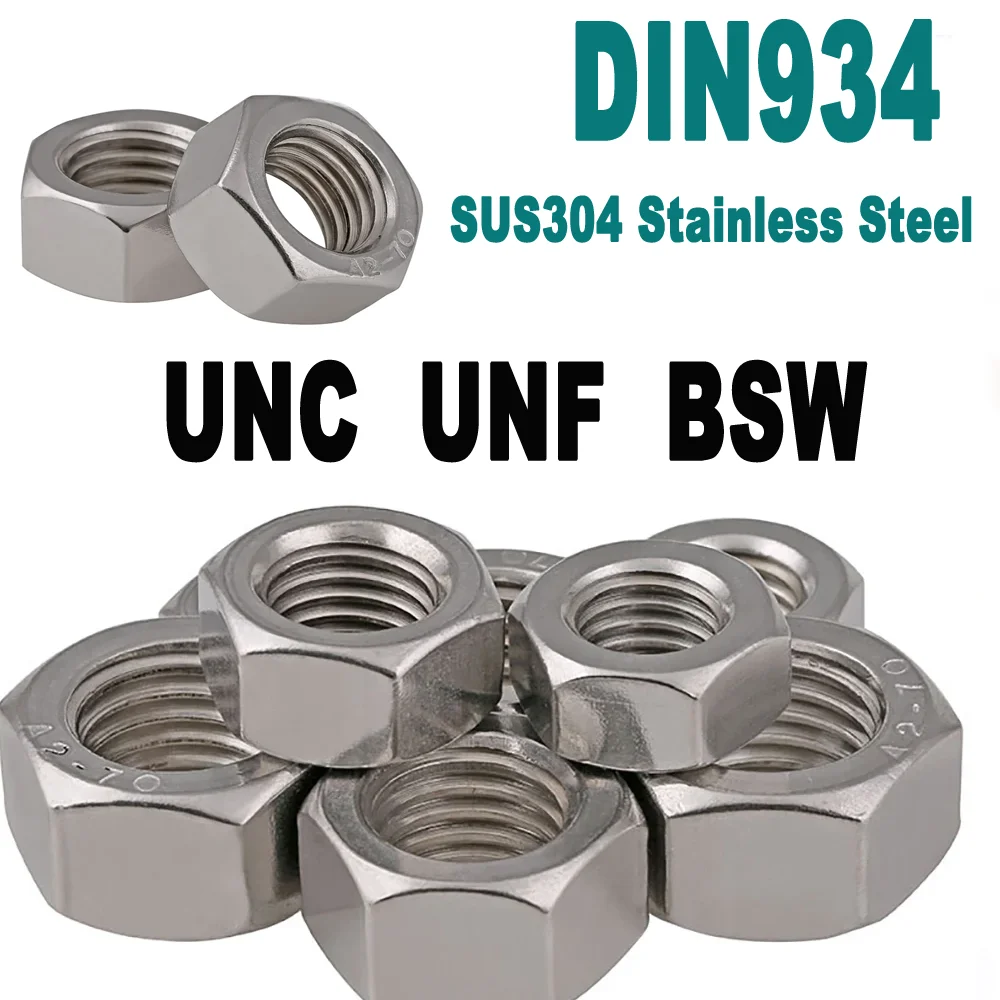 SUS304 Stainless Steel Hex Nuts DIN934 GB6170, UNC/UNF/BSW Thread, Sizes 0#-80-12#-24 & 1/4-20-3/4-10, Hardware Fasteners