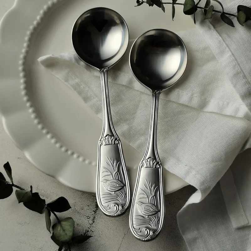Stainless Steel Flower and Bird Pattern Soup Spoon Household Tableware Dessert Scoop Round-Tipped Spoon Breakfast Porridge Scoop