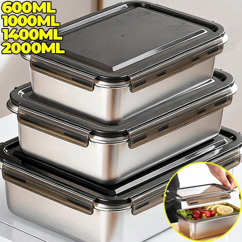 Stainless Steel Lunch Box with Lid 600/1000/1400/2000ml Food Leak-Proof Storage Container Kitchen Reusable Meal Prep Bento Box