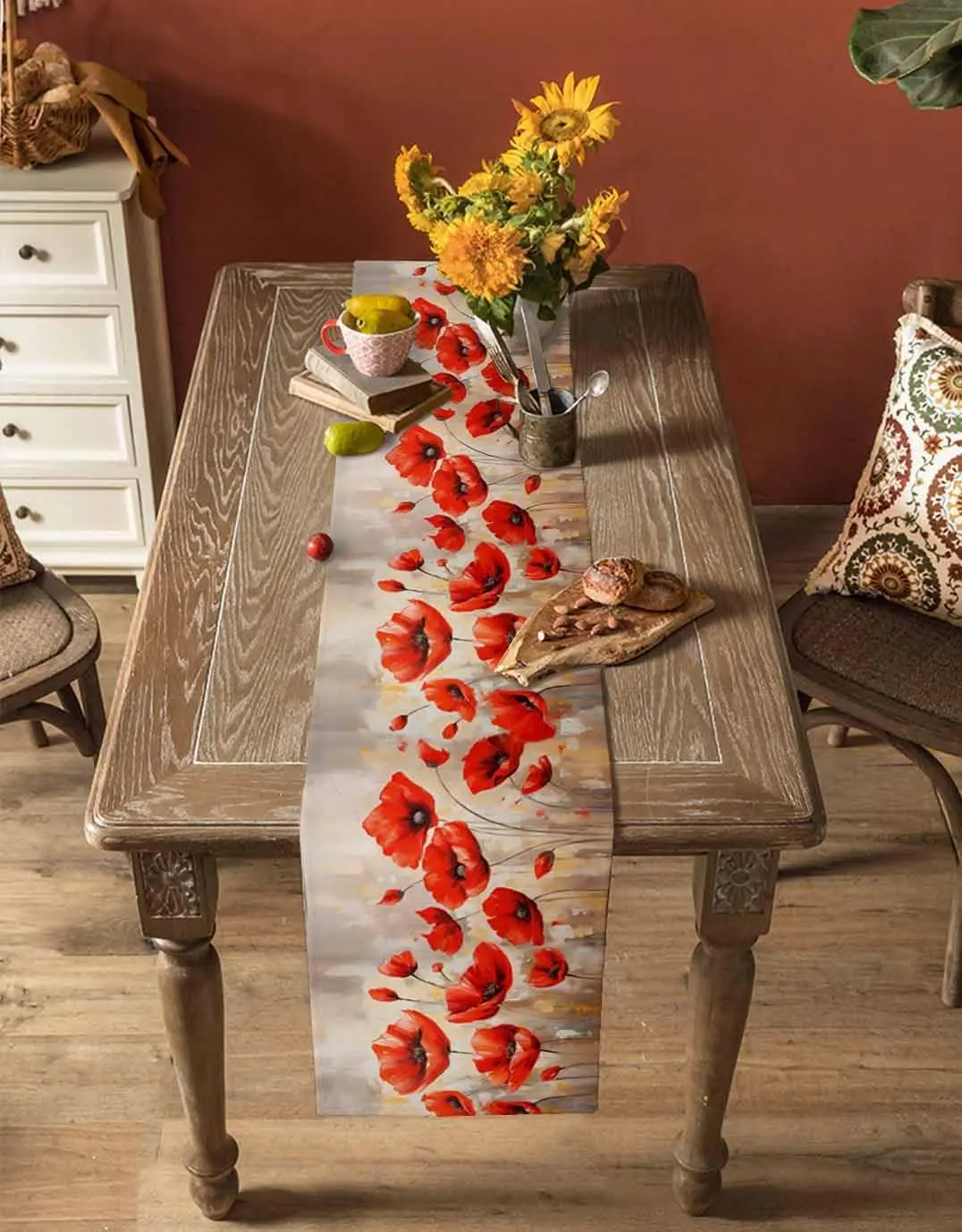 【Blooming Spring】Oil Painting Red Poppy Table Runner,Practical & Durable,Universal Dining Table Runner for Home Kitchen & Party