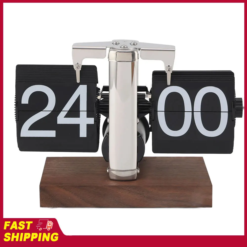 Flip Desk Clock Auto Mechanical Flip 24H Wood Base Stainless Steel Vintage Retro Digital Table Clock for Home Office