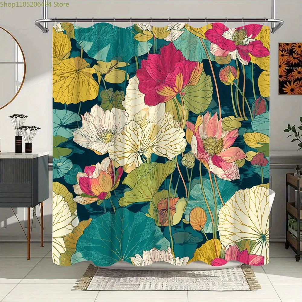 1pc Vintage Botanical Floral Shower Curtain - Vibrant Red Pink White Yellow Flowers & Textured Teal Green Leaves on Dark Teal