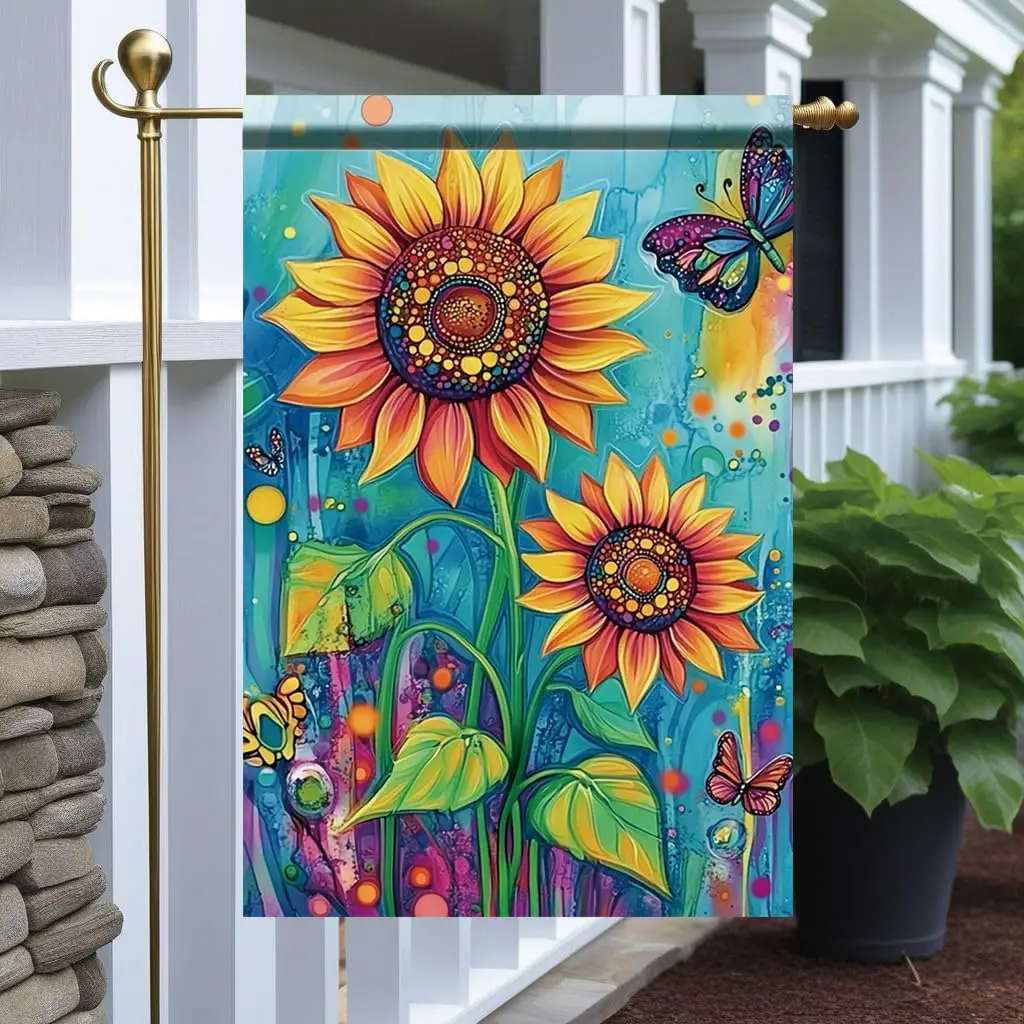 Colorful Sunflower Garden Flag 12x18 Inch Double Sided Outdoor Yard Banner Vibrant Blue Background with Butterflies and Abst FFL
