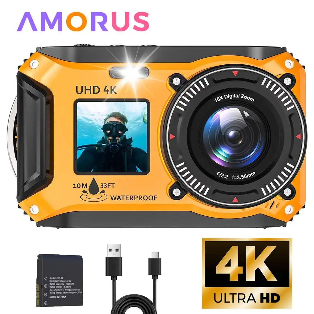 4K Underwater Camera 33FT Waterproof Camera for Snorkeling Dual-Screen Compact Dustproof Floatable Autofocus 64MP Digital Camera