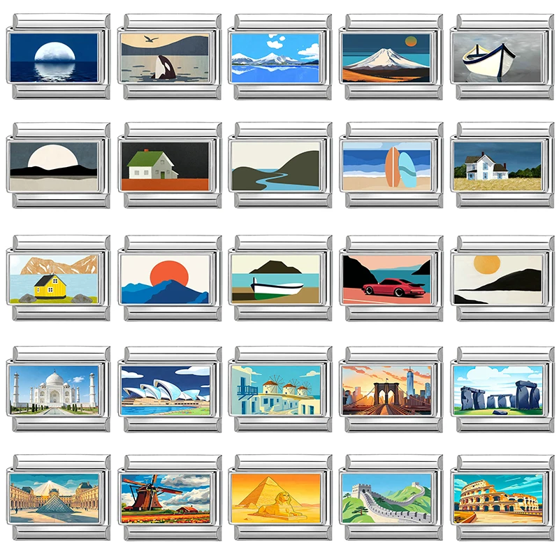 Mountains Rivers Seas World Scenic Historical Sites Italian Charm Link 9mm Stainless Steel For Bracelet Jewelry DIY Making Gifts