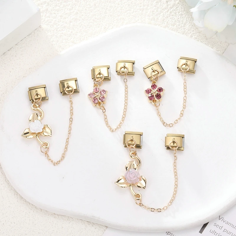 Gold Color Pink Zircon Flowers Rose Leaves Tassel Chain DIY Italian Charm Links Fit 9mm Stainless Steel Bracelet for Men Women