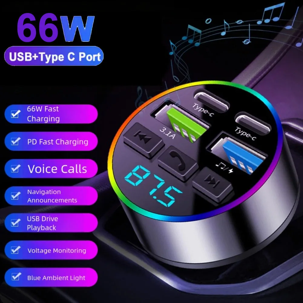 Bluetooth 5.0 FM Transmitter Handsfree Car AUX Radio Modulator MP3 Player 66W Dual PD Type-C USB Fast Charge with Volt display