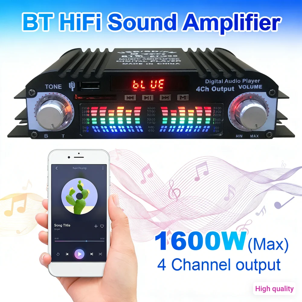 1600W Peak Power HiFi Sound Amplifier Remote Control Bluetooth-Compatible 4 Channel HiFi Stereo AMP Mini HIFI Digital Stereo Amp