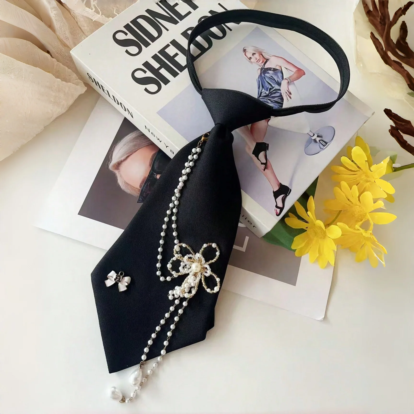 Unique Design Black Tie for Women, Pearl Flower Bow Accessory, Sweet and Cool Jk Style, Personalized Fashion Decoration Trend